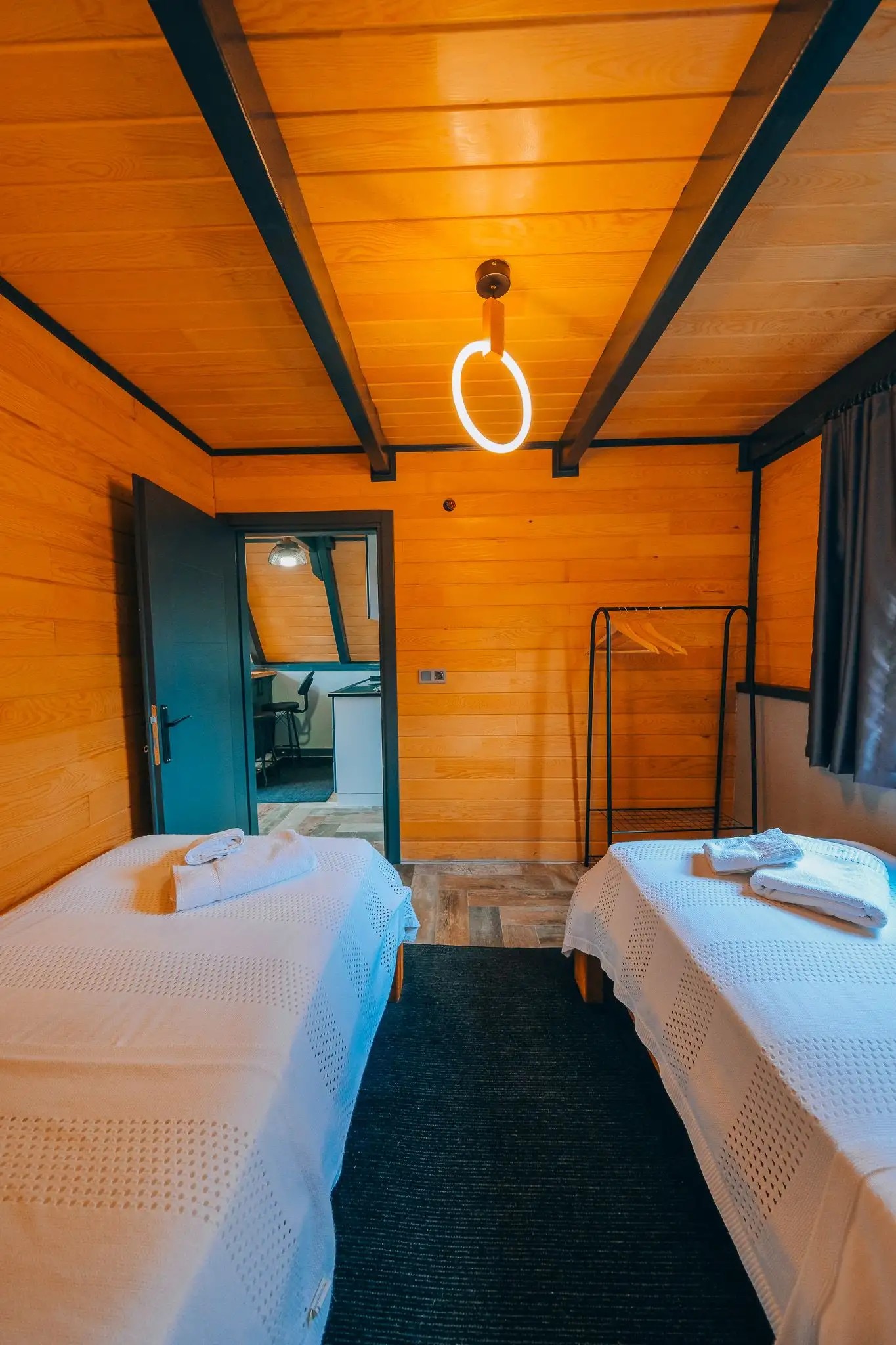 2. Yatak odası: Alt katta 2 adet tek kişilik yatak, elbise askılığı bulunur.