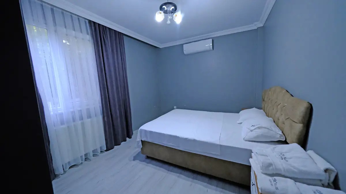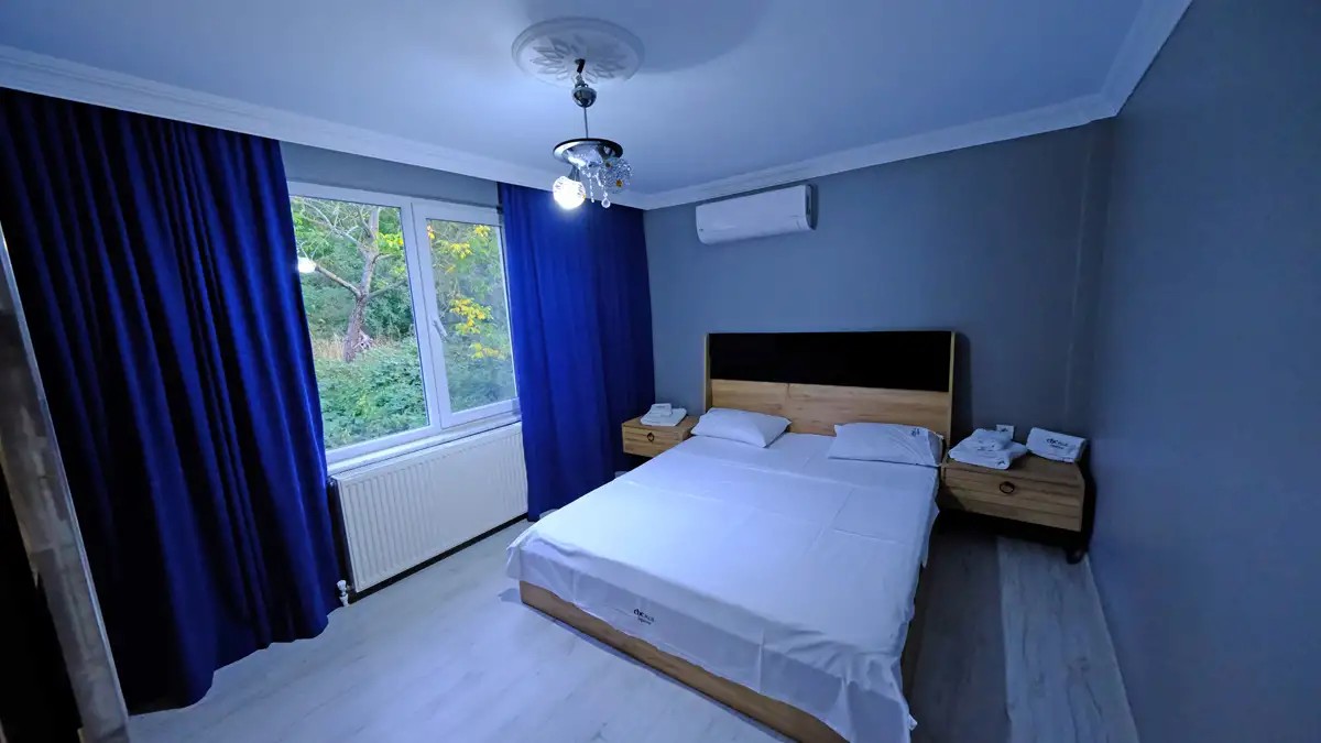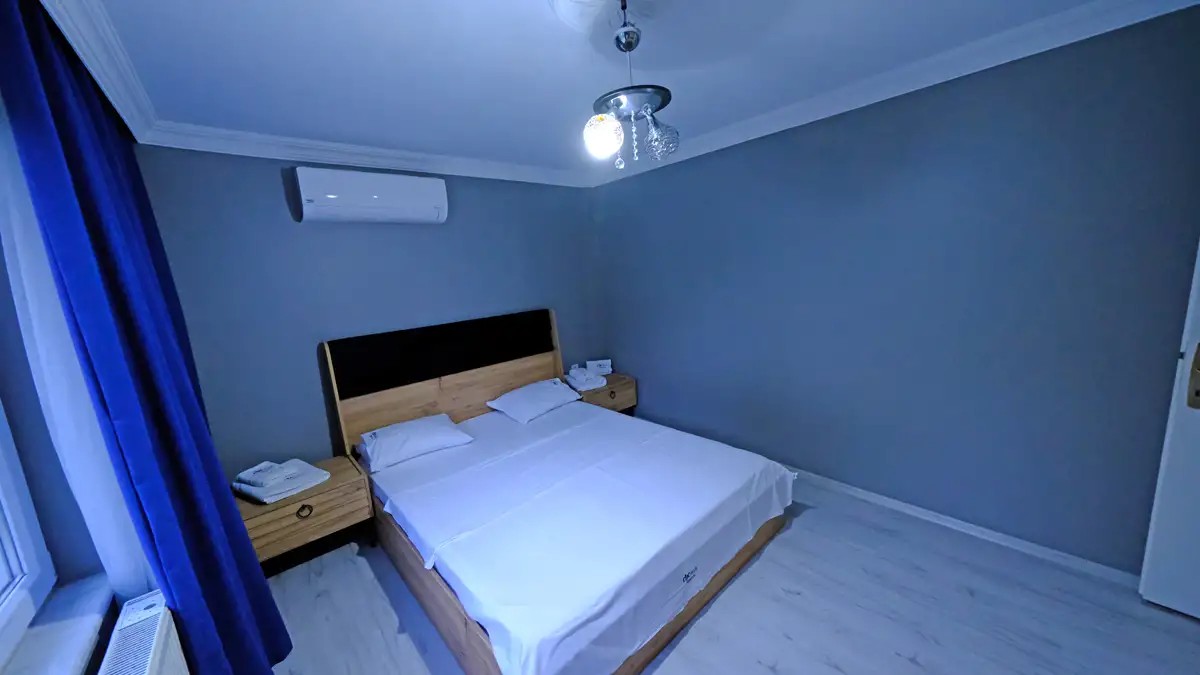 2. Yatak Odası: (Alt Kat) 1 çift kişilik yatak, 1 gardırop, 1 klima ve vestiyer bulunmaktadır.
