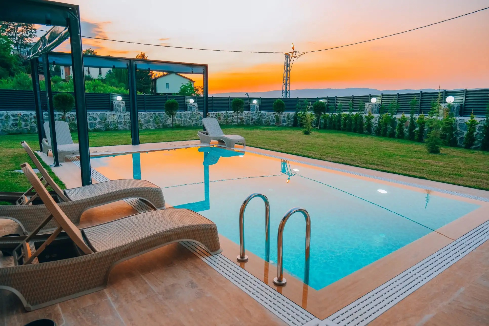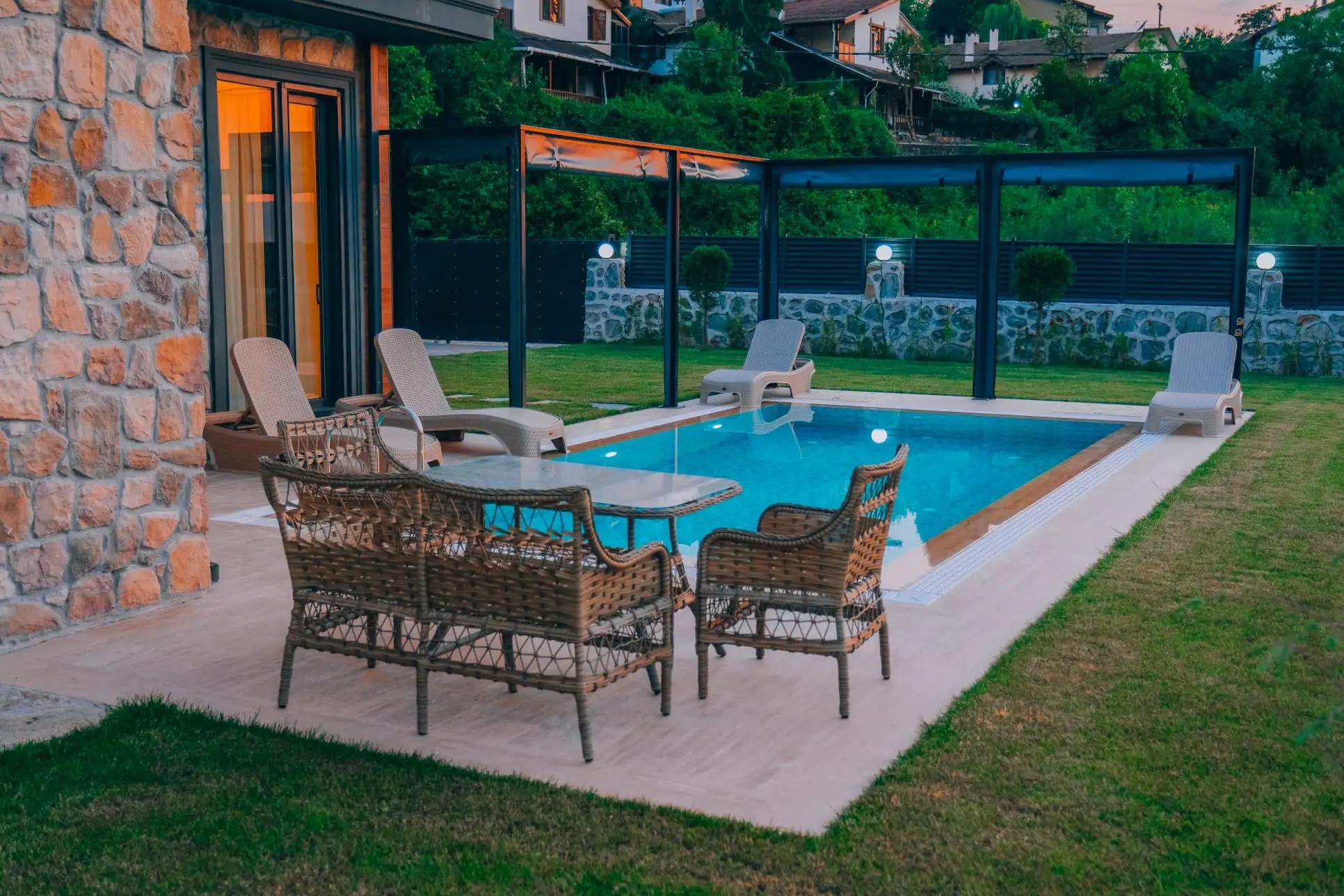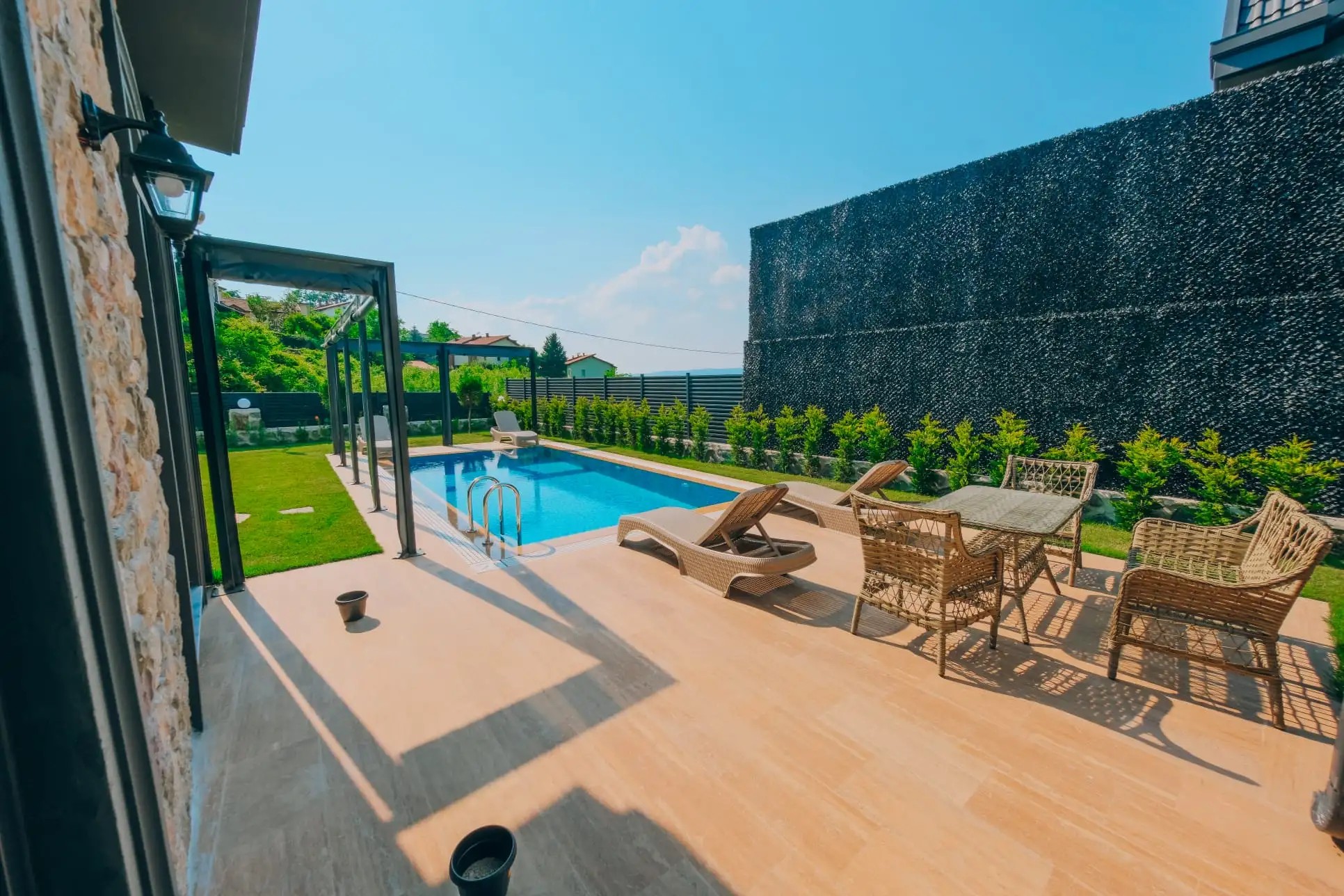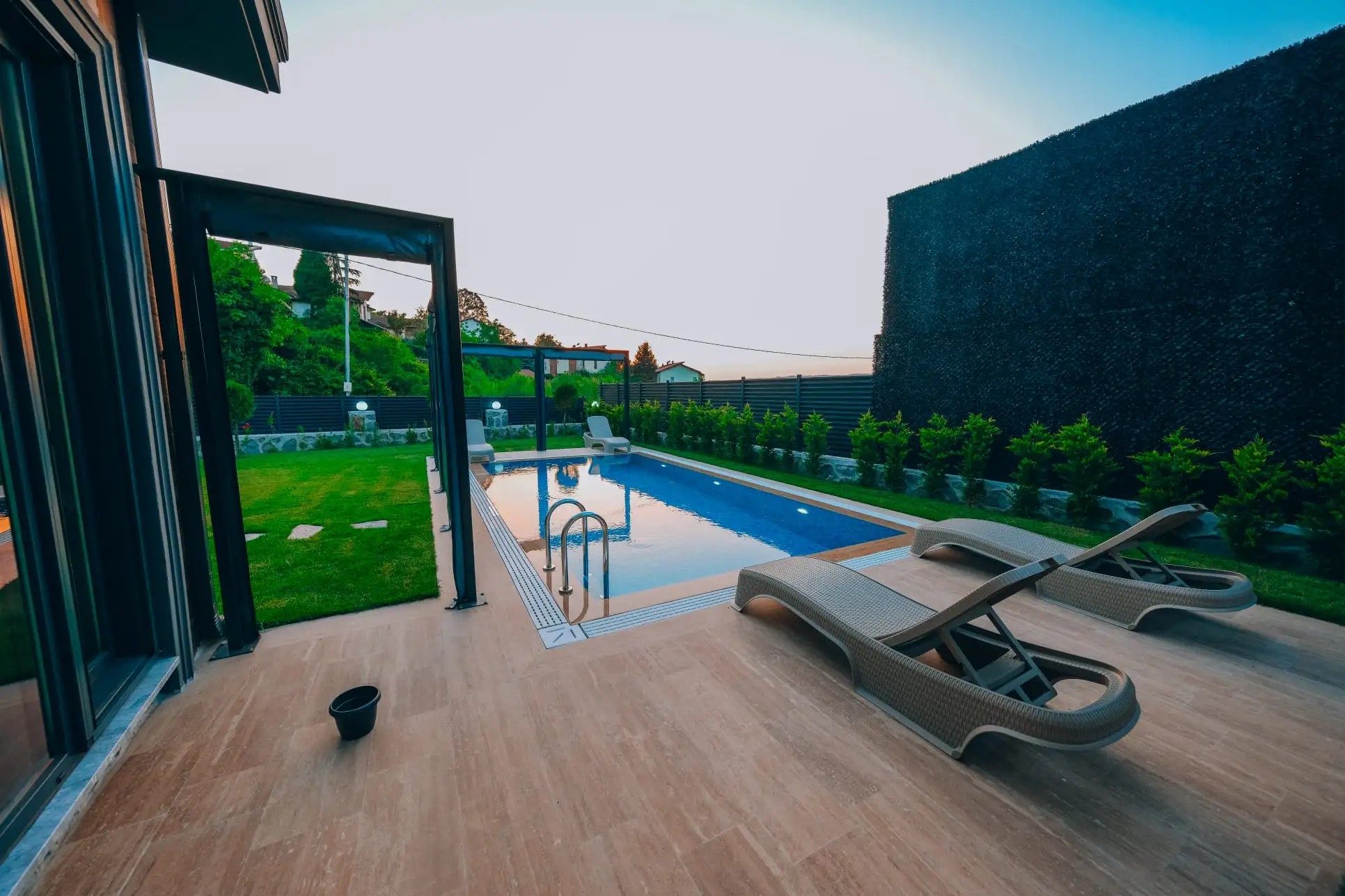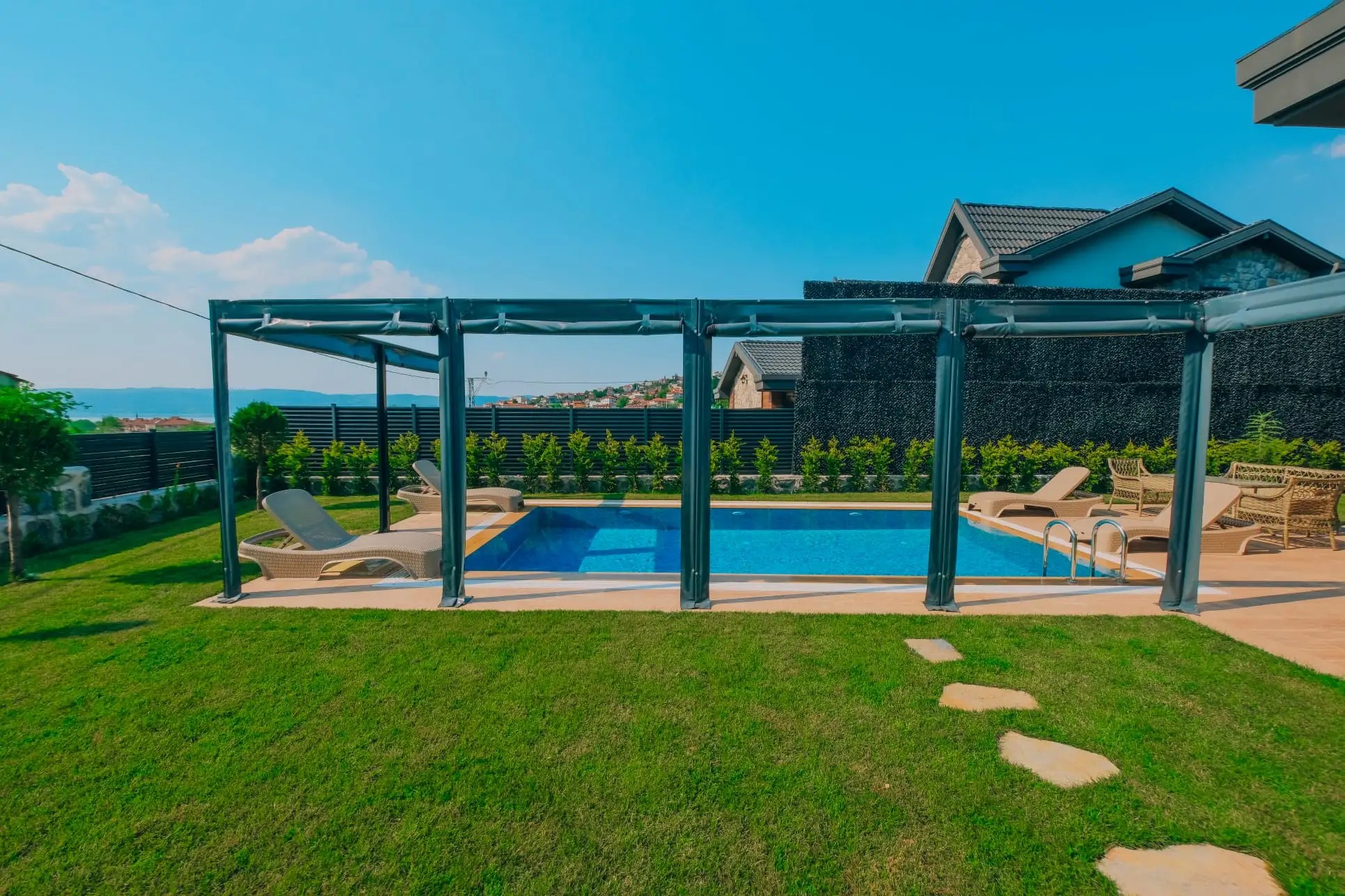 Bahçe: Tam korunaklı Özel Isıtmalı havuz(4x8 m 1.50 m derinlik), barbekü, şezlong, şemsiye, bahçe mobilyaları bulunmaktadır.