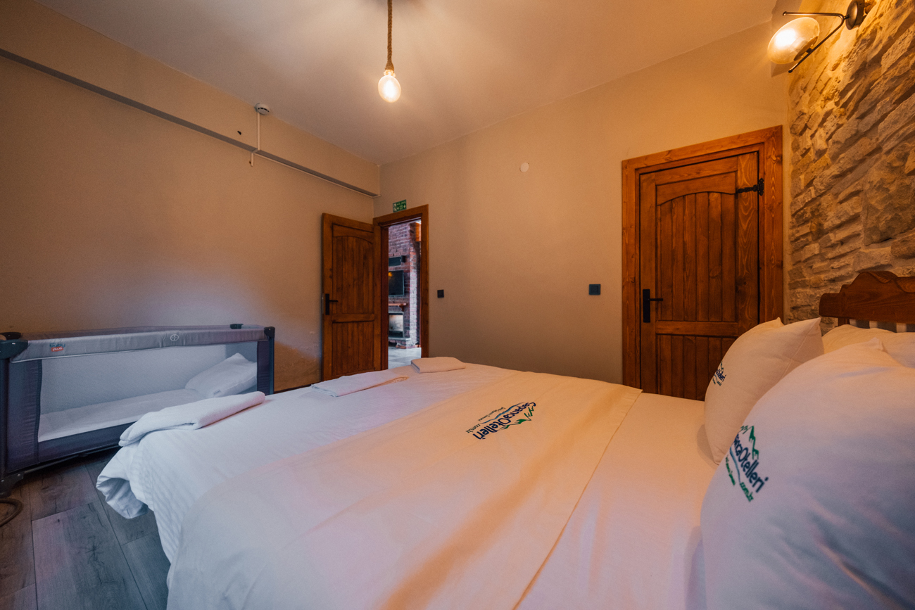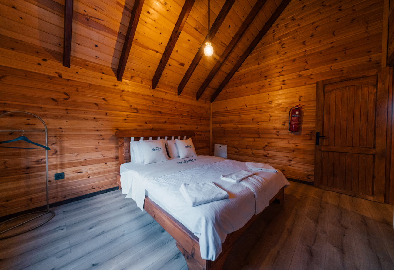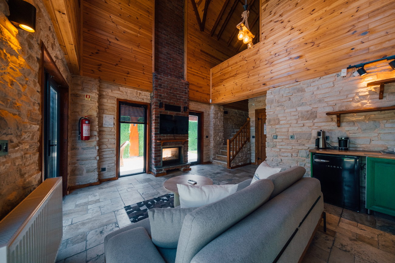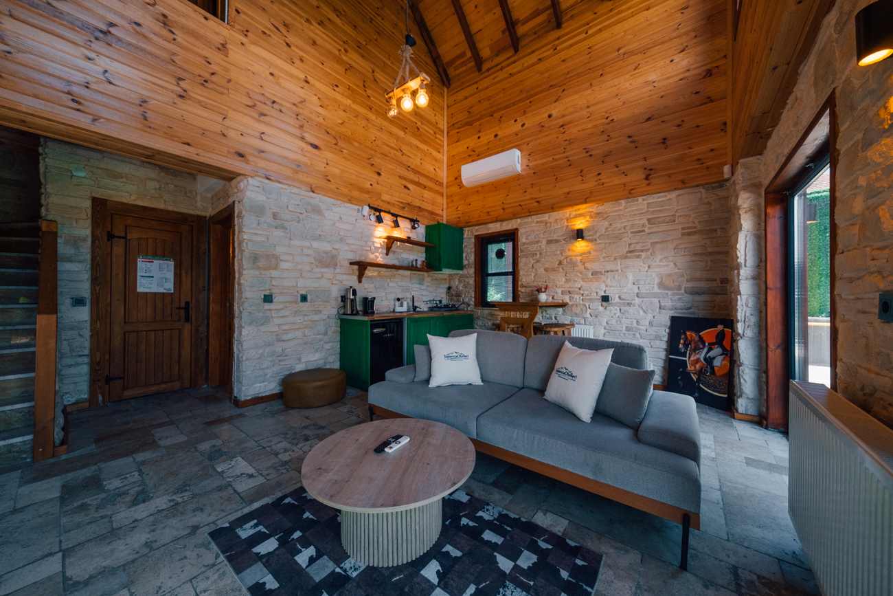 Salon: Açılır kanepe, şömine, yemek masası, TV, klima, Wifi, Wc & Banyo bulunmaktadır.