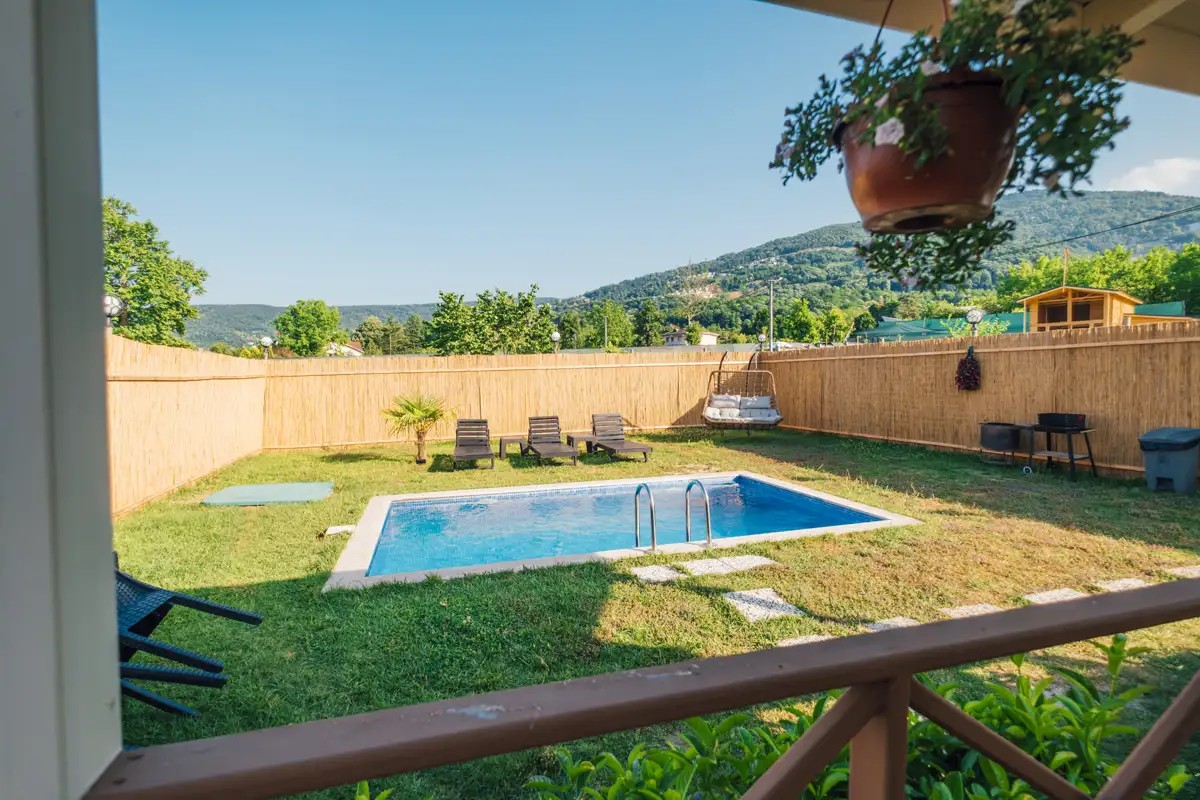 Bahçe: Özel Isıtmalı havuz(3x5 m 1.50 m derinlik), ateş kazanı, barbekü, şezlong, şemsiye, salıncak ve çocuk oyun parkı bulunmaktadır.